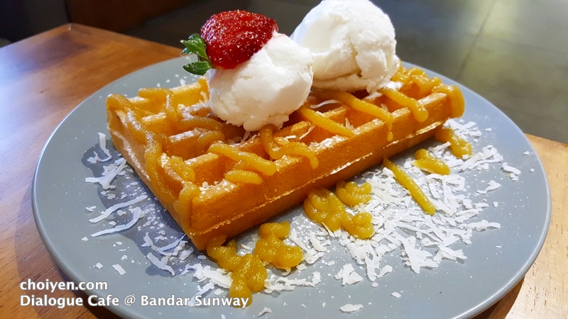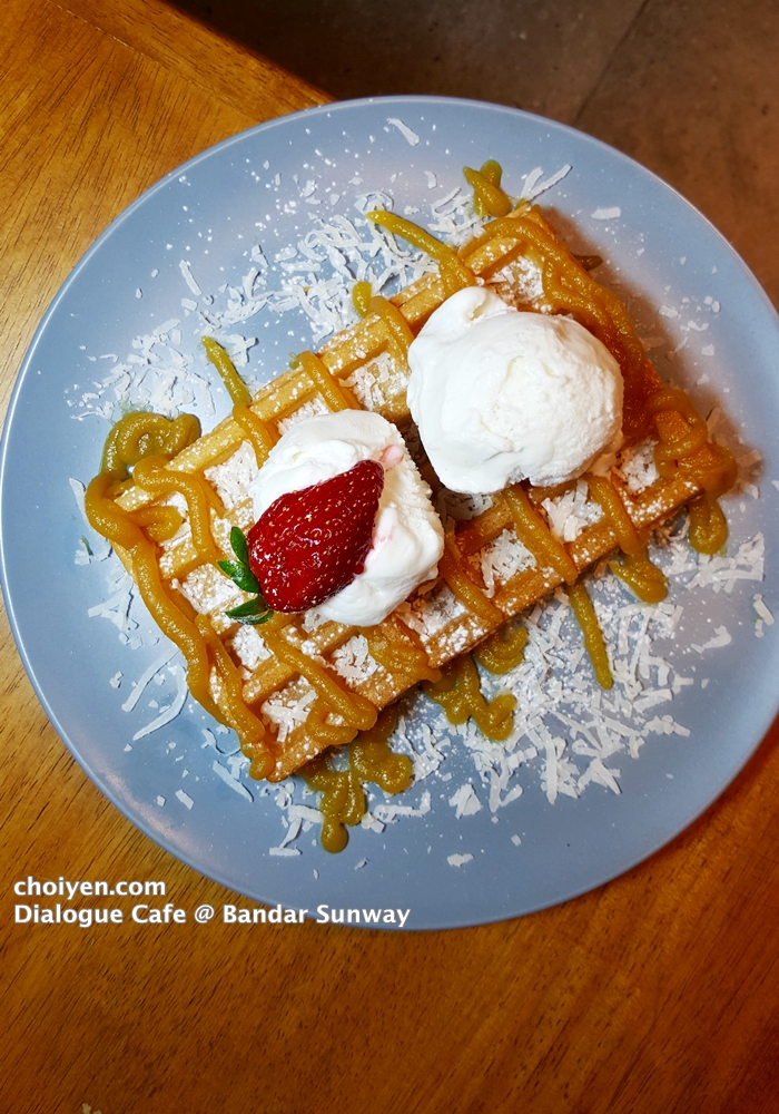 The crispy waffle with soft inner was generously sprinkled with desiccated coconut and fragrant kaya (coconut jam), topped with two scoops of ice cream (we had coconut ice cream that day. A well executed western dessert paired with local ingredients.