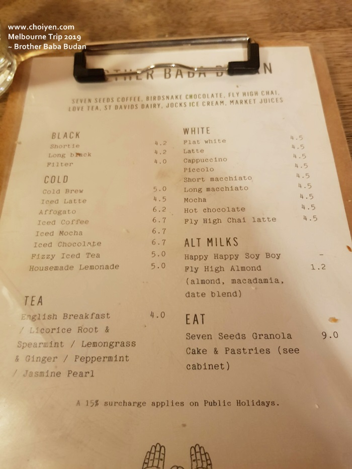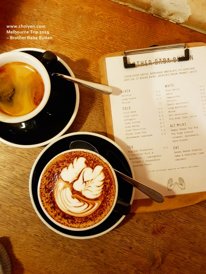 At Melbourne, you will be spoilt with the choices of coffee joints that ranges from posh to industrial style to quick-good-tiny place. While the latter (quick-good-tiny place) is one of the features at CBD Melbourne, I am quite surprised how cozy it is from the inside when I walked into Brother Buba Budan.