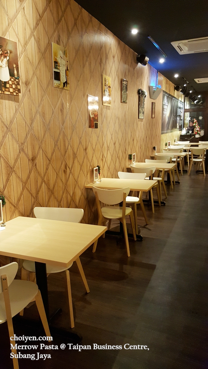 Located at Subang Jaya’s bustling Taipan Business Centre, Merrow Pasta boasts a cozy interior partnered with clean and pleasant setting. Plenty of wooden tones are used, the furniture, flooring and patterned wall. With a mixture of contrast colour of black, potted plants, artworks adorning the walls as well as mellow lighting liven up the overall feel.