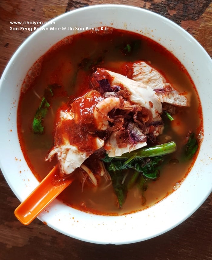 This is the San Peng Prawn Mee that got much praised from hubby and his friends. It’s a road side stall near Pudu LRT Station parking, a rather shabby setting if you ask me, with less than 10 tables. There were quite a lot of flies too. >_<. They offer Prawn Mee, Dry Prawn Mee, Lam Mee, Fish Balls Noodles and Kai Si Hor Fun (noodles with shredded chicken).