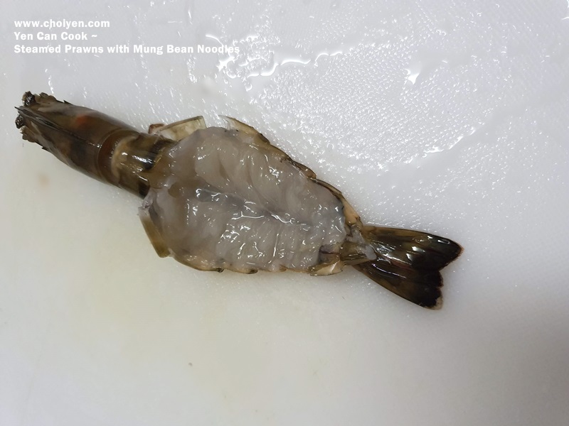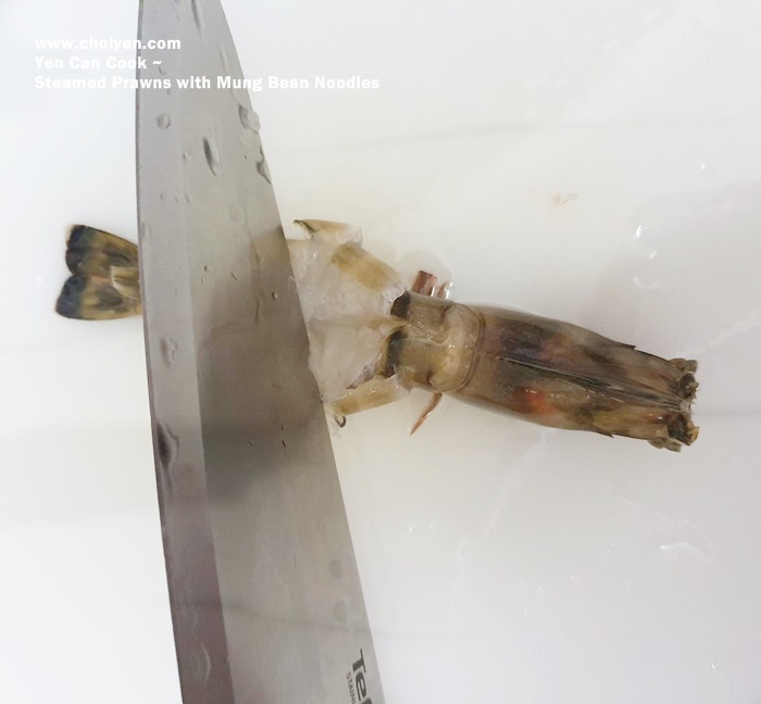 Use the back of a knife, slightly “pound” the opening of the prawn, so that the opening will remain nicely flatten (without curling up) after being steamed.
