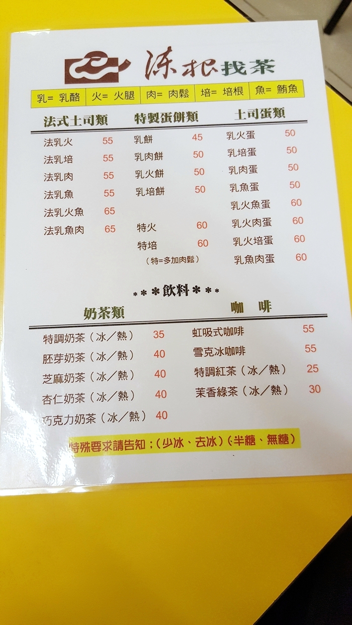 Menu in Chinese. Basically there are only 3 food available, French Toast, Taiwanese Pancake and normal toast (bread) with various combinations with different fillings such as cheese, ham, meat floss, bacon and tuna. Beverage is limited to milk tea in assorted flavors, coffee and teas.