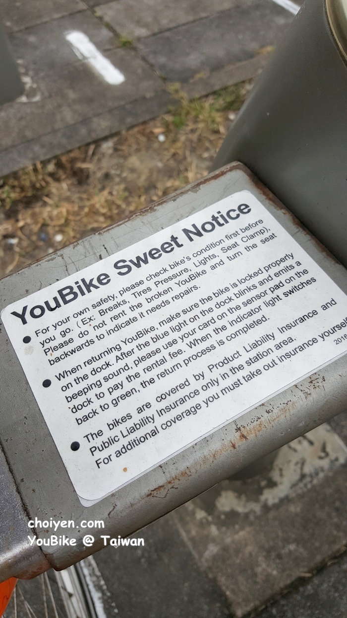 Notice board at the station in Chinese ONLY. >_< This really inconvenient for those who can’t read Chinese. Apps are available to find bike rental stations too such as Fun Travel in Taipei (in English) and YouBike (fully in Chinese). The apps can tell you how many bikes are available at the station, and how many free slots are open to return one.