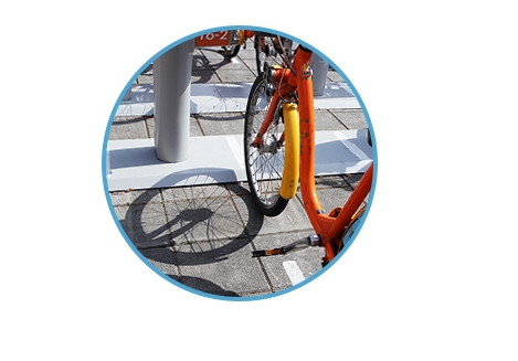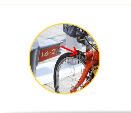Select an empty dock indicated by a blue light on the sensor pad on the dock. Align the head of the bicycle to the white line on the ground, aim the bicycle lock to its docking port then push the bike all the way in.