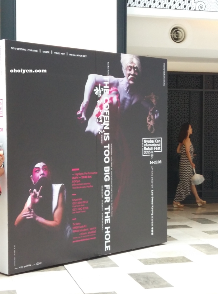 在Publika ’Nyoba Kan Butoh Festival‘ 寿板舞踏祭。 源自于日本,舞踏是現代舞的一種形式,由日本舞蹈家土方巽和大野一雄於二次大戰後所創,企圖破壞西方對於表演、動作、和肢體的傳統美學觀點,追求肉體之上的心靈解放和自由。舞踏的舞者通常全身赤裸並塗滿白粉,表演中常包含吶喊、扭曲及匍匐。 诡异和特慢的动作,恕我没有艺术细胞不会欣赏。真正的表演是怎样我不清楚,但在农历七月就是俗称的鬼月上演是特地的吗?