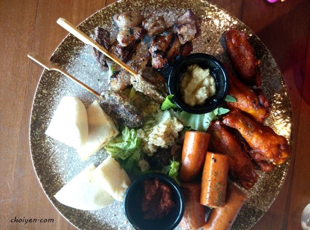 羊肉串,烤羊排,鸡肉香肠,水牛城鸡翅,鹰豆泥, 藜麥沙拉及面包. 味道不错,尤其是那羊肉串软嫩之余还很够味