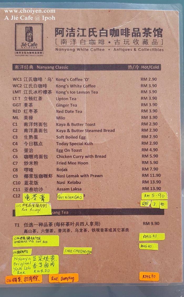 The first photo of the cafe resembles someone’s house….I even see a rotan hanging…hahaha! ;D I’m a little confused about the white coffee…the cafe’s name is A Jie but the signboard says Chang Jiang White Coffee. The glass partition says Nanyang White Coffee while the menu mentions Kong’s White Coffee. So, which white coffee is it exactly? 😛 I’ve tried Chang Jiang white coffee before in KL but didn’t like it.