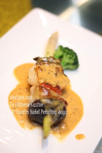 The next dish was a lemongrass skewer of grilled scallop, prawn, Shiitake mushroom and capsicum dressed with creamy Mongolian sauce. All the items on the stalk was perfectly grilled to retain their crunchy and juicy nature while the Mongolian sauce with hint of black pepper provide extra zing to the dish.