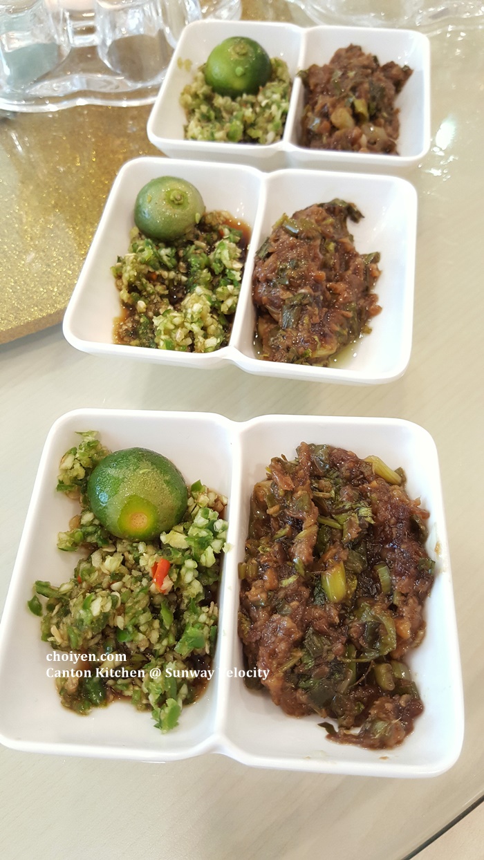 Two types of sauces to go with the dishes: Minced bird eye chili with garlic and lime & Minced ginger with coriander.