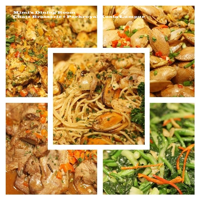 Main dishes of Spaghetti Aglio-Olio with Seafood, Chinese Baby Kailan, Roasted Lamb with Garlic Rosemary Sauce, Clams in Oyster Sauce and Mexican Baked Fish.