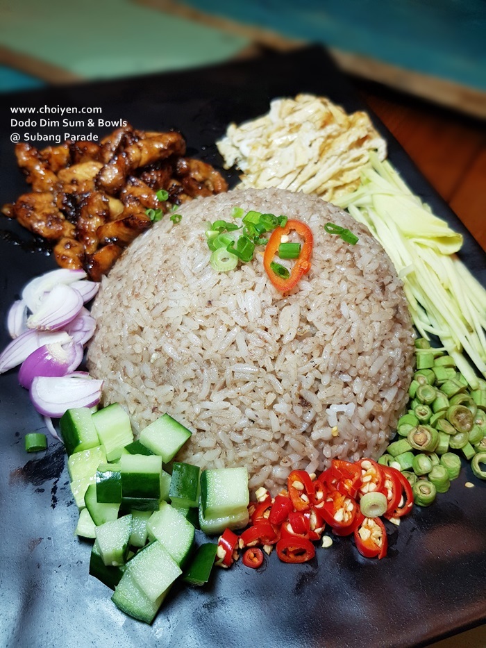 Fried rice with shrimp paste with that fragrant distinctive shrimp paste aroma and flavour comes with condiments of stir fried chicken/beef, shredded omelette, julliened young mango, onion, cucumber, chili and long beans.