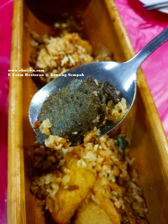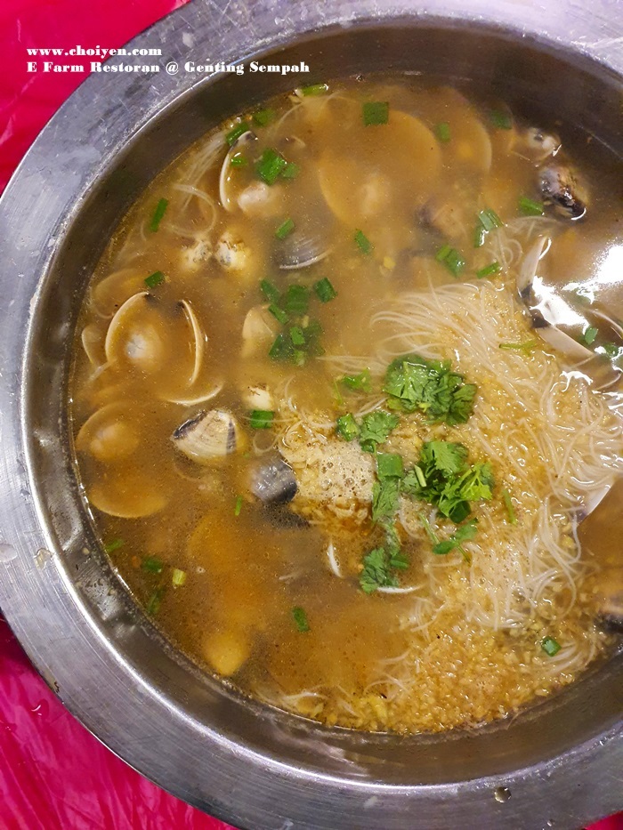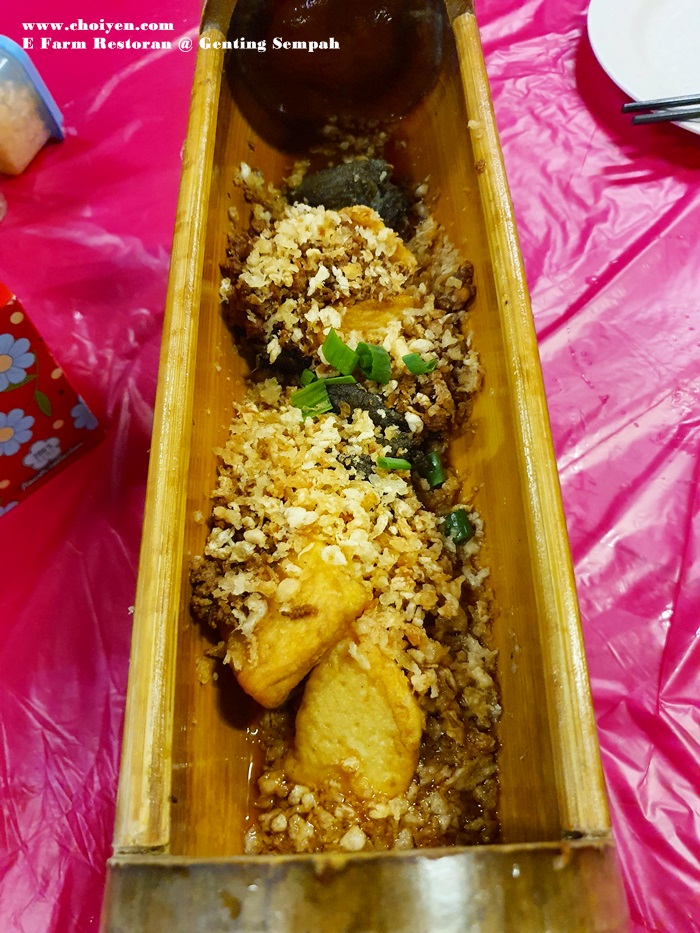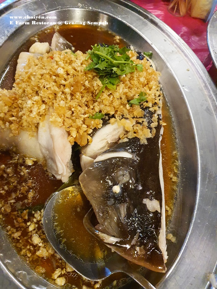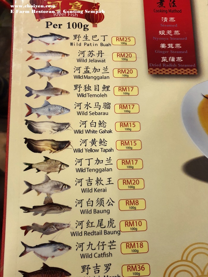 Like most of the restaurants in this vicinity (Gohtong Jaya & Bukit Tinggi), the highly prized river fishes took center stage in the menu and there are many choices with price tag being clearly stated. E Farm Restoran also offer an extensive list of seafood, poultry, pork, vegetables, tofu and soup dishes which included Nyonya Cuttlefish (RM25 & RM50), Claypot Glass Noodles with River Prawns (RM15/100g), Clam & Pig Stomach Soup (RM40 & RM80), Pineapple Fried with Intestines (RM30 & RM60), Pineapple Braised Pork Belly (RM40 & RM80), Steamed Chicken with Ginger Paste (RM50 & RM100), Wolfberry Madeira Vine (RM12 & RM23) and Ginger Paste Beancurd (RM20 & RM38) , just to name a few special ones.