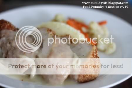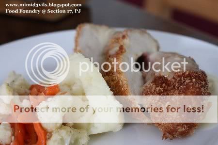 3 big slab of deep fried bread crumbled chicken breast crumbled with mashed potato & some boiled vegetables and served with cream sauce (which we felt its too little for us).