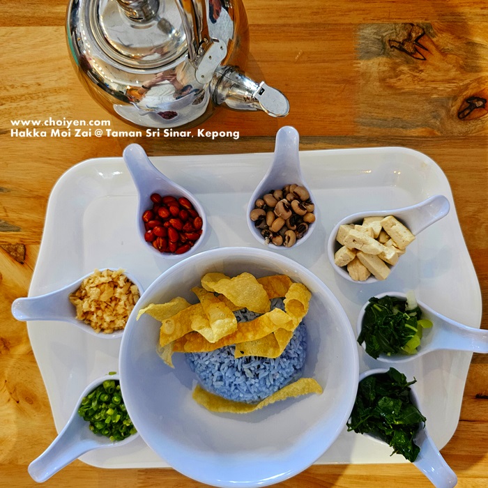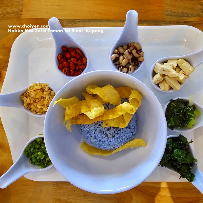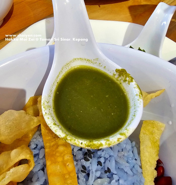 The Lei Cha is made up of seven different colourful condiments filled in deep spoon, served with blue tinted rice and crunchy crackers. There were peanuts, preserved radish (Choy Poh), long beans, black-eyed peas, dried bean curd, Sayur Manis, Choy Sum (?), as well as the Lei Cha broth was served in a teapot. With such an aesthetic presentation, I imparted a high expectation on the taste, however I was slapped with disappointment. The chef must be heavy handed when comes to salt, the key element of Lei Cha tea broth was really salty, too salty that I had to stop drinking it after a couple of sips.