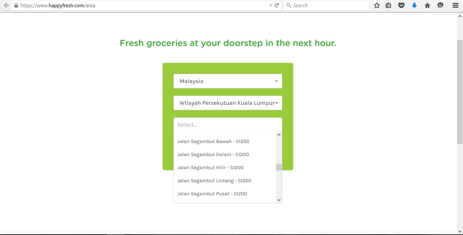 HappyFresh deliveries are currently available in main areas of Kuala Lumpur, Jakarta, Bangkok and Greater Bangkok. If service in your area is currently not available, rest assured that they are working hard to cover it as soon as possible.