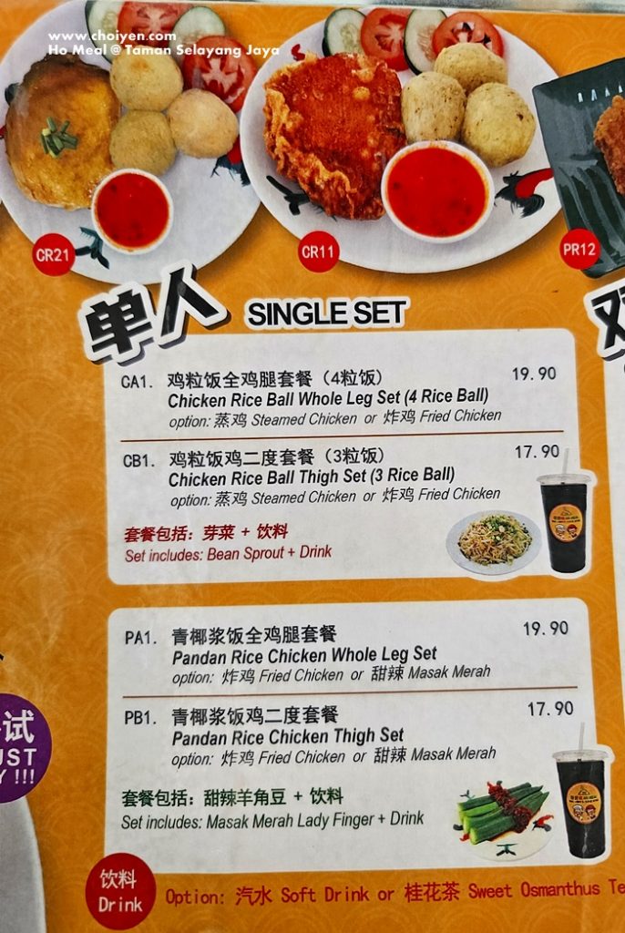 The set comprises 1 steamed chicken whole leg, 1 fried chicken whole leg, 8 rice balls, bean sprouts, pork balls soup and 2 drinks. Single portion and ala carte order for both chicken rice and Nasi Lemak are available too.