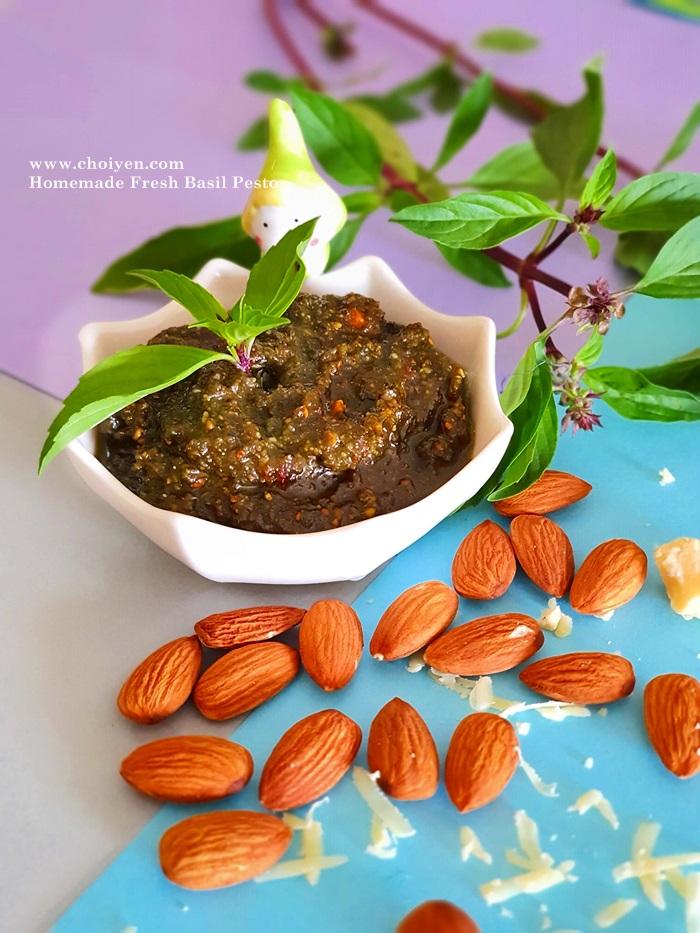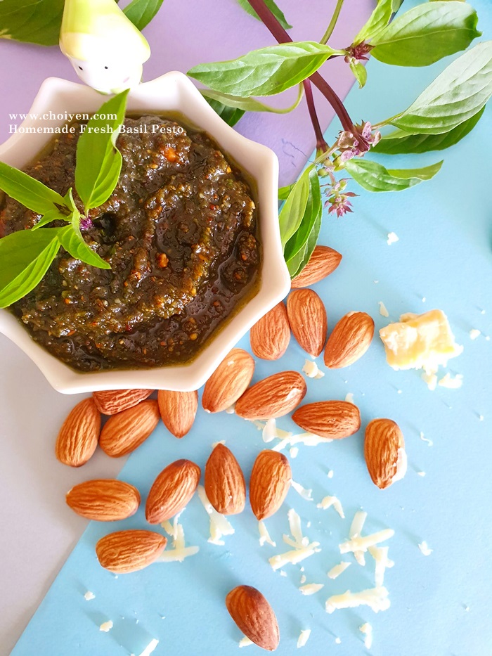 So, how I used up all my Thai Basil? Homemade pesto, the first thing that came into my mind! Instead of pine nuts which are traditionally used in pesto, I used almond instead because almonds are more “wallet friendly” 😛 Other nuts such as walnuts and pecans are good options as well.