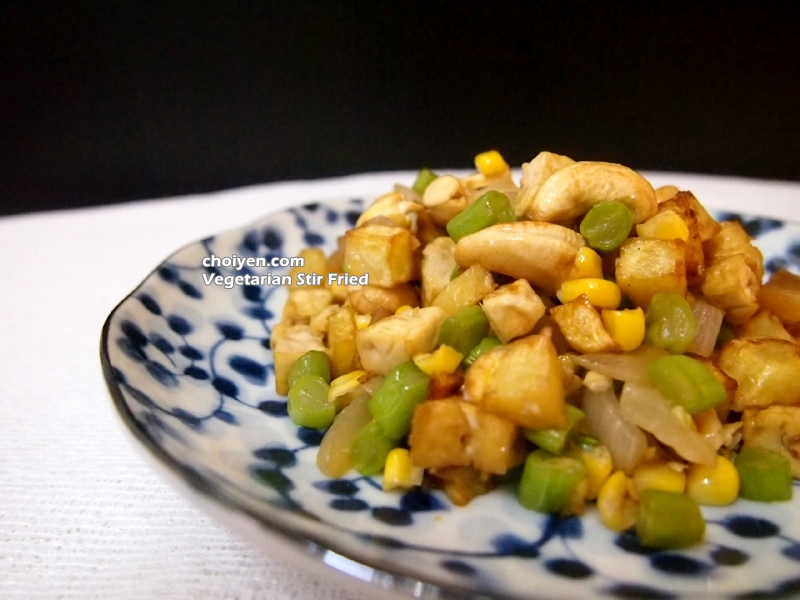 Step 2: Heat oil in a frying pan, fried the cashew nuts, potato cubes, firm beancurd cubes till golden brown. Remove from pan, drain oil and set aside.