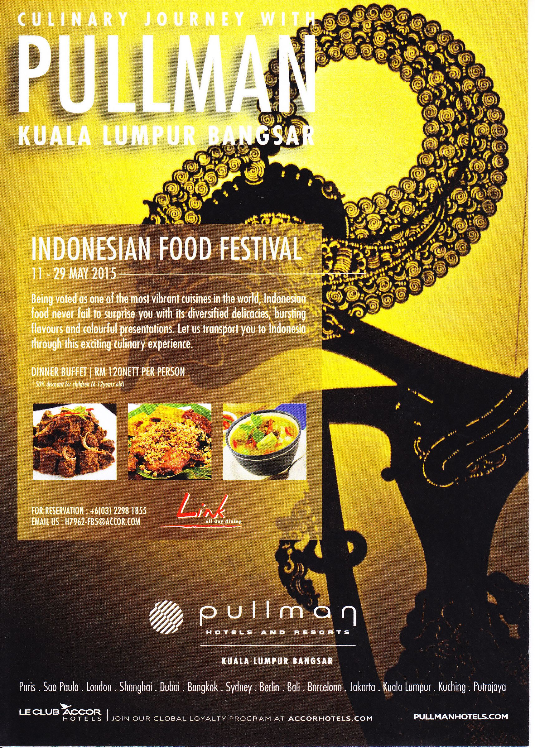 The whole Indonesian food experience is priced at RM 120.00nett per person (50% discount for children between 6-12 years old) commencing from 11 to 29 May 2015. Available from 6.30pm to 10.30pm daily.