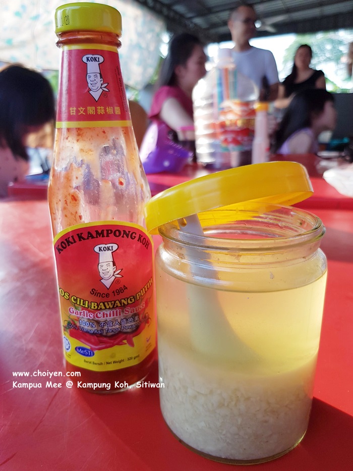 Condiments placed on every table, Kampung Koh Chili Sauce & garlic vinegar.