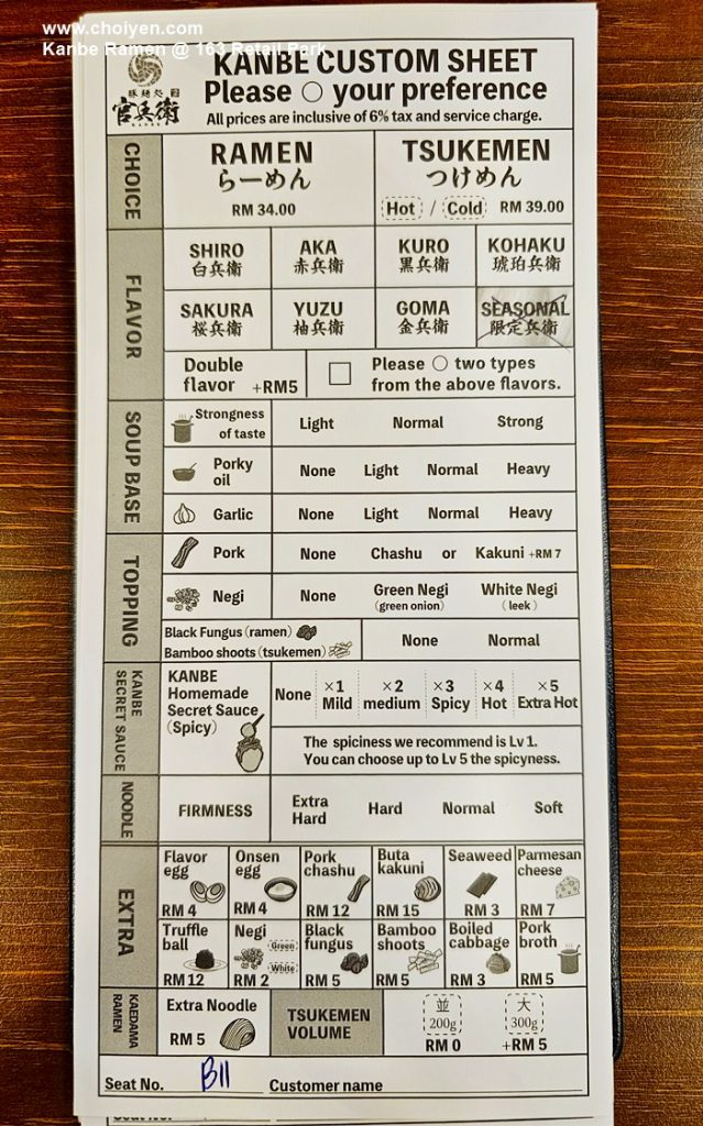 Customers can customize their bowl of noodle by filling in the preference of each ingredient on the order sheet.