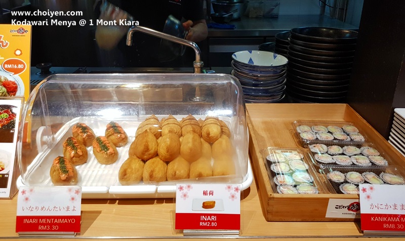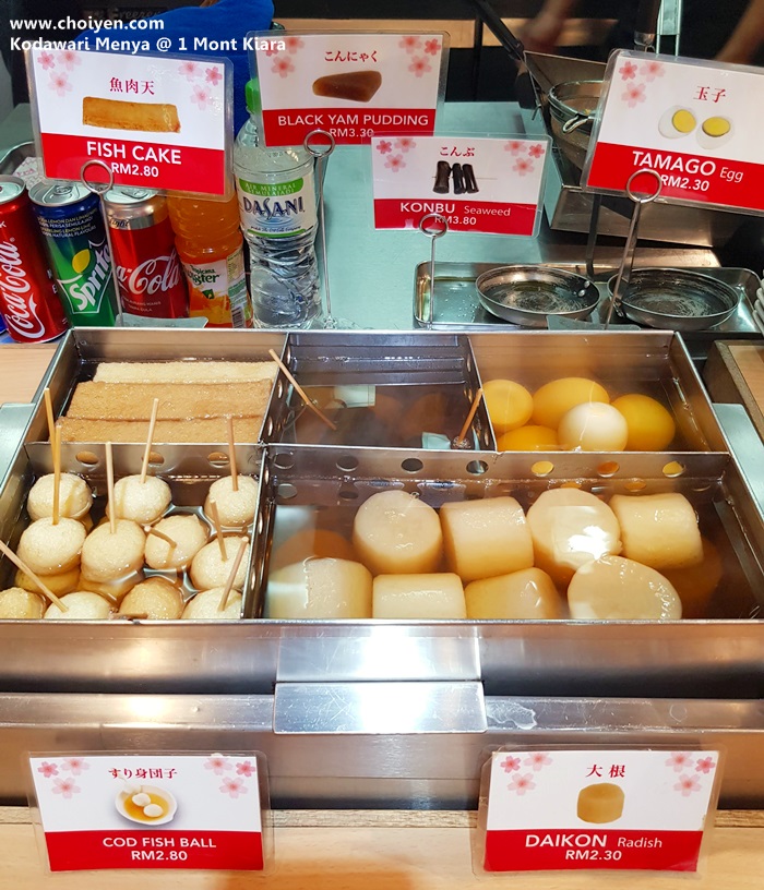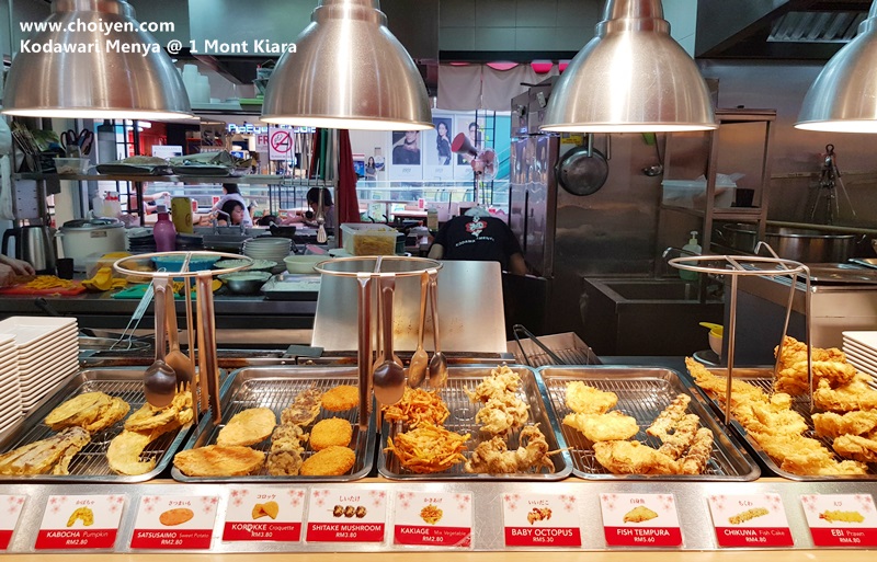 Assorted of tempura to go with your udon such as eggplants, sweet potatoes, croquettes, Shitake mushrooms, baby octopus, fish cakes, fish fillets, prawns and chicken, priced from RM2.80 to RM5.60.