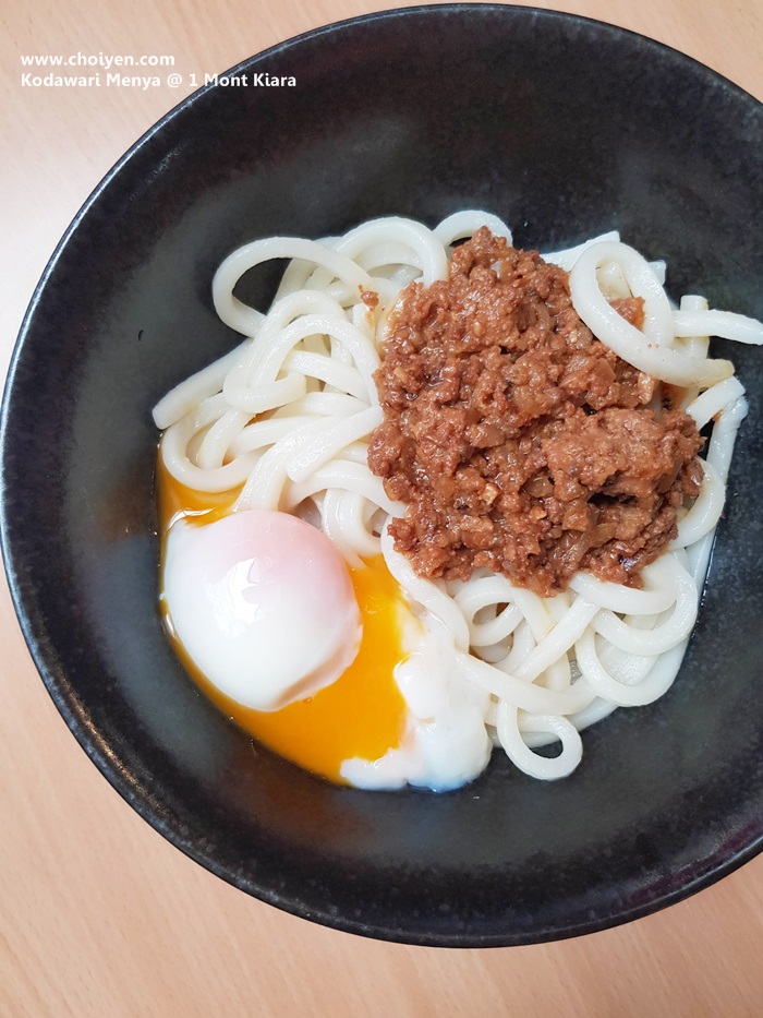 Minced beef infused with salty miso and paired with cooked to perfection onsen egg. Have a good mix and let every strand of udon lusciously coated with the creamy egg and meat mixture, a truly slurpilious experience that can make your day.