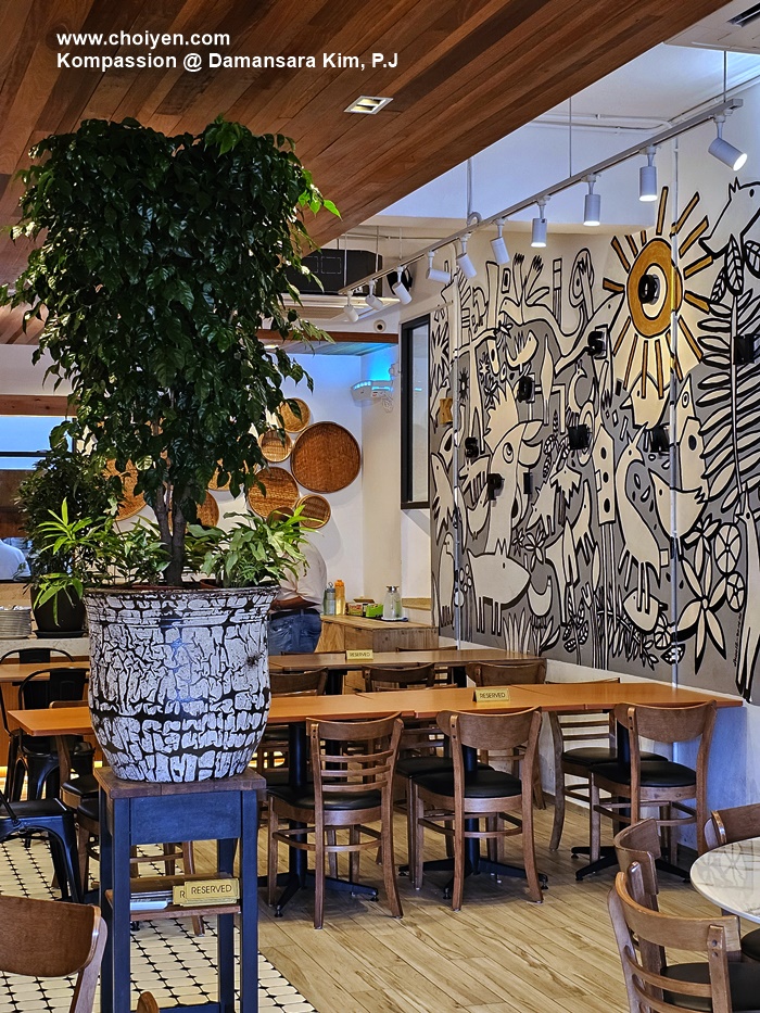 The restaurant is now expended to two shoplots and the interior had a major facelift which give it a modern and chic look. Big glass panels, combination of wooden and checkered flooring, wooden furniture in different designs, doodle art mural, as well as plants are placed here and there (there’s even a big potted plants in the middle of the dining area).