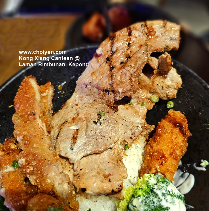 Grilled Pork Neck is Kong Xiang Canteen’s signature dish which can be served with rice or Ramen, and even croissant. The large menu also covers sizzling Yakisoba with different mains (Unagi, grilled Salmon, grilled pork patty), a list of snacks, grilled items (pork neck, Abura Age, Unagi), assorted bento rice, Ramen, kids meals, tea time special (FOC a cup of tea/coffee for every dessert order, 3-6pm daily), jumbo bowl rice, dessert (croffle and Mochi) and beverages.
