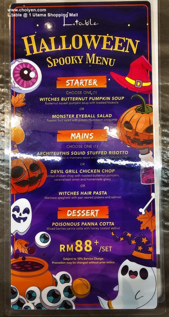 This year, the Deepavali and Halloween are falling on the same day – October 31, so hubby decided to try on L.table’s three course Halloween Spooky Menu priced at RM88.