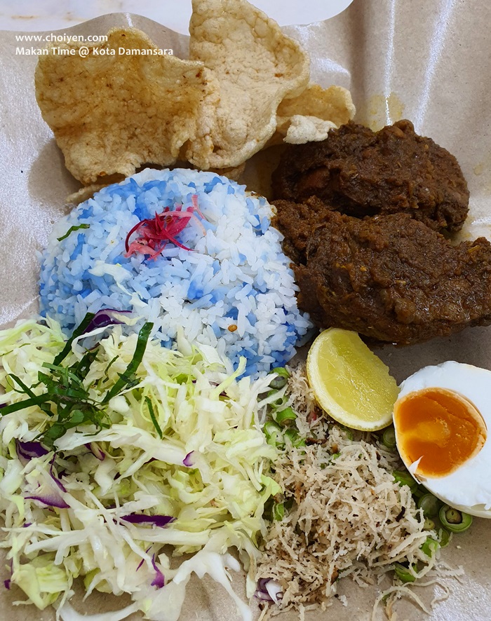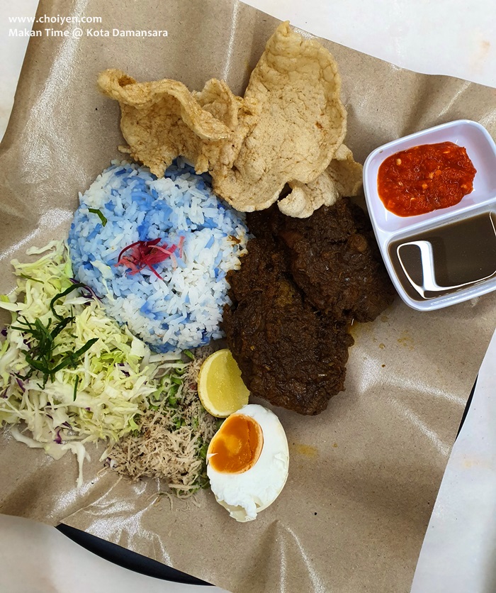 Completed with accompaniments of shredded cabbage, salted eggs, grated coconut, fish crackers, Sambal and Budu (fermented fish sauce), we opted to have Kerutuk Ayam to go with the blue butterfly pea rice.