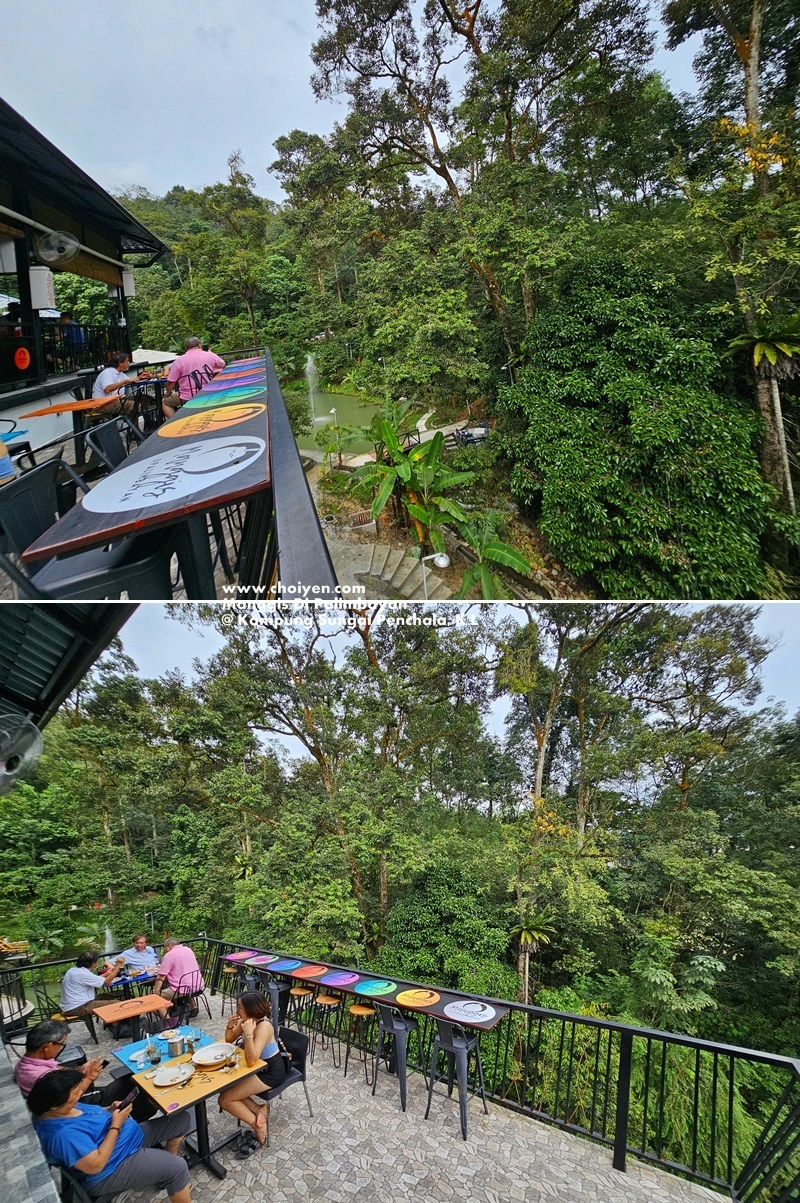 There are usual tables and chair in the semi open dining area, balcony seating that overlooking the tropical trees, seating along the pathway with patio umbrella, as well as a more undisturbed corner on the platform that set amongst the trees.