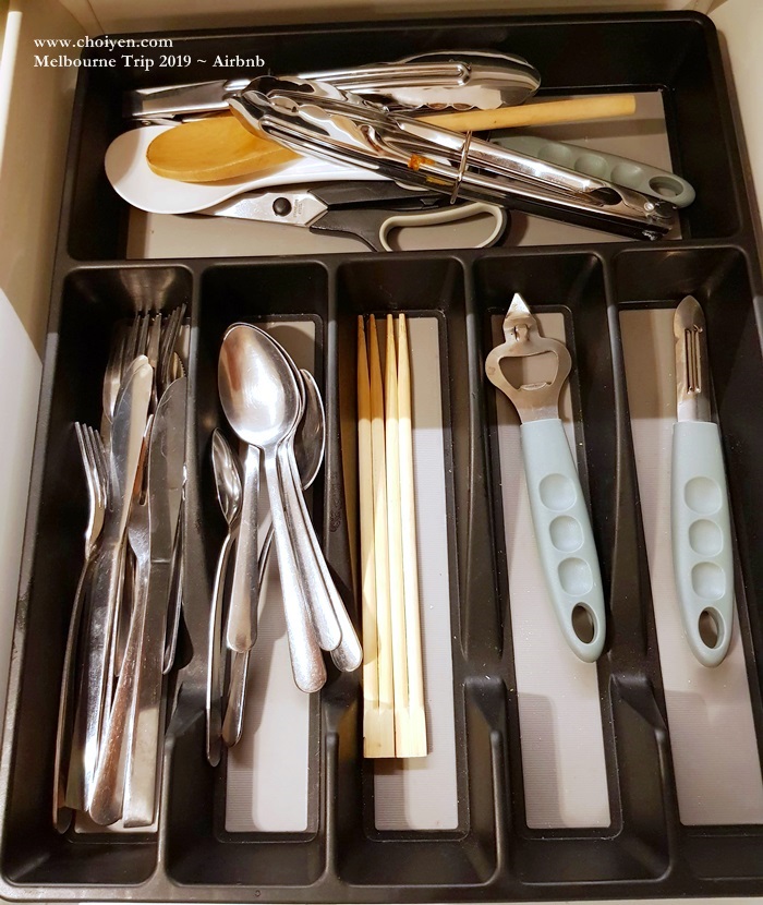 Cooking up a storm in this kitchen is no problem at all. Pan, microwave oven, rice cooker, toaster, electric kettle, knives, plates, bowls, cups, wine glasses, cutlery and assorted condiments are nicely prepared. (But I’m not sure if the condiments are prepared by the owner or from the previous tenant as we left our unfinished ketchup there)