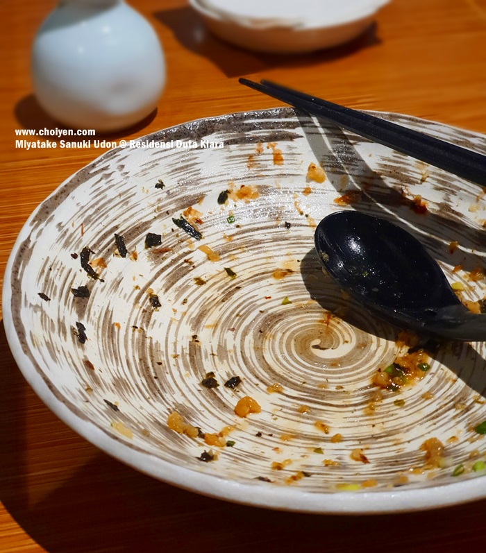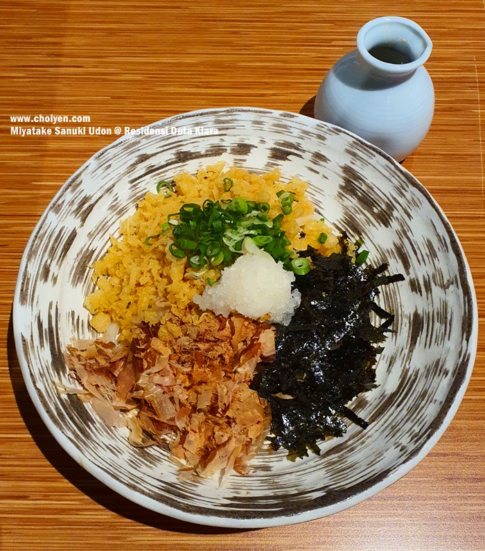 Previously operated in Isetan, 1 Utama, Miyatake Sanuki Udon is now reopened at Residensi Duta Kiara, a stone’s throw from Solaris Mont Kiara. The dining area is spacious and there are quite plenty of seating included some semi-private partitions and counter seats which can catch a glimpse of the chefs at work. Themed in a soothing neutral tone, nothing much on decorations, the overall ambience was delightfully accentuated by the soft yellow hue (but not friendly for photography =.=”).