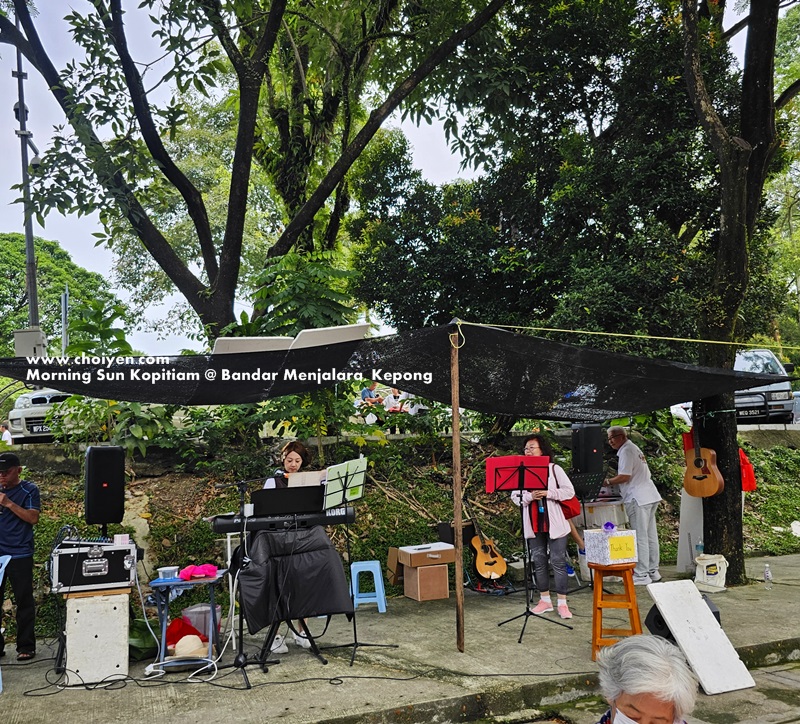 Morning Sun Kopitiam, located right opposite Taman Tasik Menjalara is one of the popular breakfast spots for exercisers in this area. The live band performance with a shabby setting was completed with proper sound system, musical instruments and singer, don’t play play I tell you (o^-’)b. One can also make request to perform on the “stage”. (´∀`)