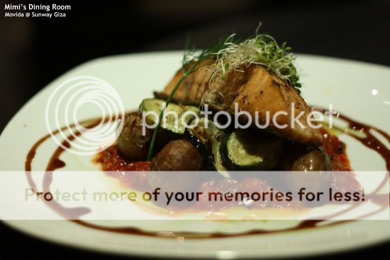 Big slab of salmon served with boiled baby potatoes, zucchini ribbon & appetizing spicy tomato sauce.