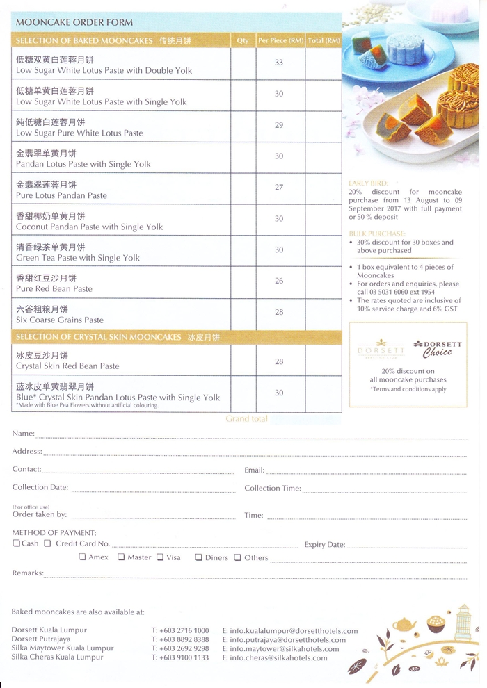 The mooncakes are available for sale between 13 August and 4 October 2017 at Dorsett Grand Subang, Dorsett Kuala Lumpur, Dorsett Putrajaya, Silka Maytower Kuala Lumpur and Silka Cheras Kuala Lumpur. Members of Dorsett Prestige Club and Dorsett Choice are entitled for 20% discount throughout the sale period.