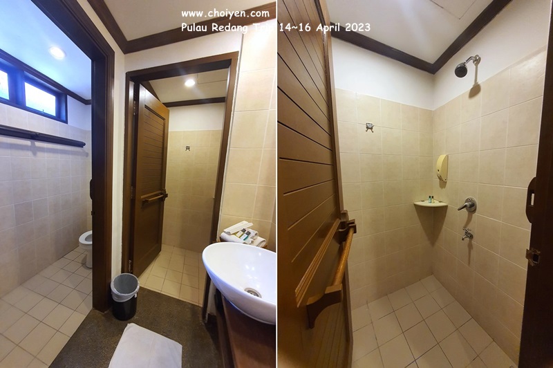 Our Deluxe Garden Room on second floor was spacious, equipped with a queen size bed and two single beds as well as an extra single size mattress, which can accommodate up to six persons. The design of the wooden themed room was a bit dated but rather well maintained. Basic amenities such as TV (with limited channels), air-cond, ceiling fan, luggage rack, safe deposit box, disposable slippers and coffee table were provided. Yes, WIFI wasn’t available in the room. (‘A`)