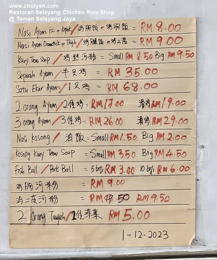 I came across Restoran Selayang Chicken Rice Shop from XHS and since the location isn’t too far, it didn’t take long for us to pay it a visit. The restaurant is a typical no-fuss, no frills Kopitiam setting with many ceiling and wall fans provide a moderate comfort level for dine-in. Parking can be slightly challenging at this area, so be patient.