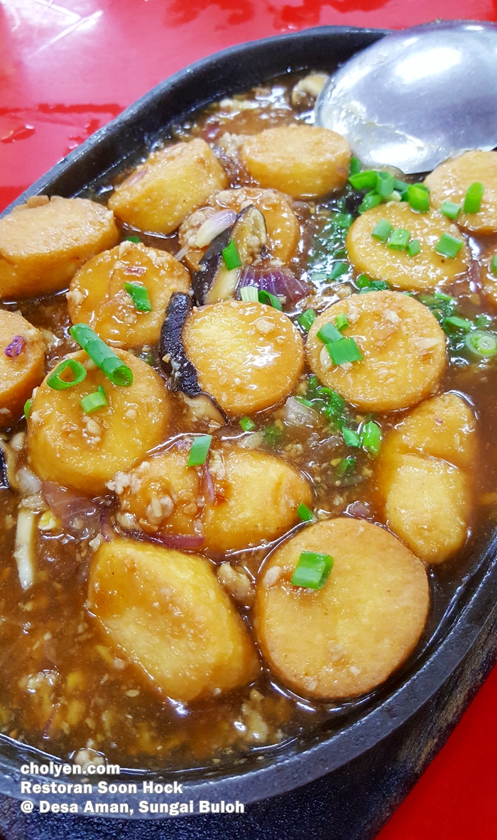 A very common “Dai Chow” dish of Japanese tofu discs served on hot iron cast plates with savoury brown gravy. There was a layer of omelet on the bottom and the gravy was prepared with generous amount of minced pork, onion and sliced mushrooms.