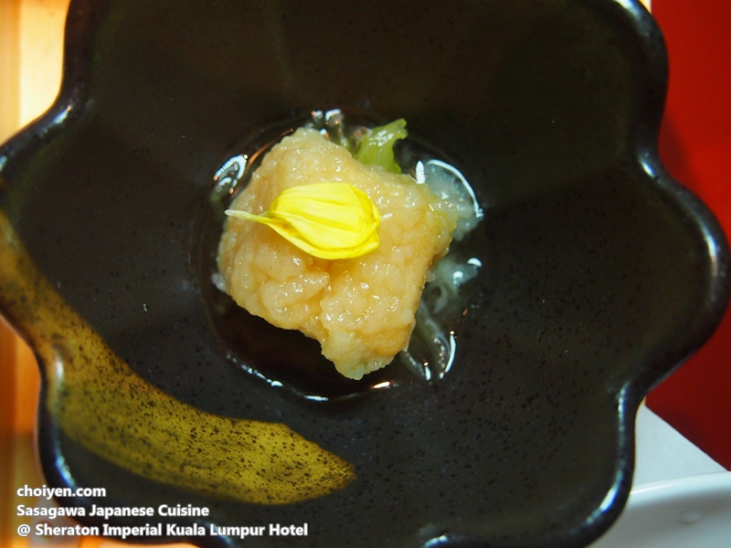 A dainty piece of fried Cutlass fish prepared with Nanbanzuke style sitting on pool of marinated shredded loofah and prettified with Chrysanthemum petals. Very light in flavor with mild acidic end note that enough to awake my appetite.