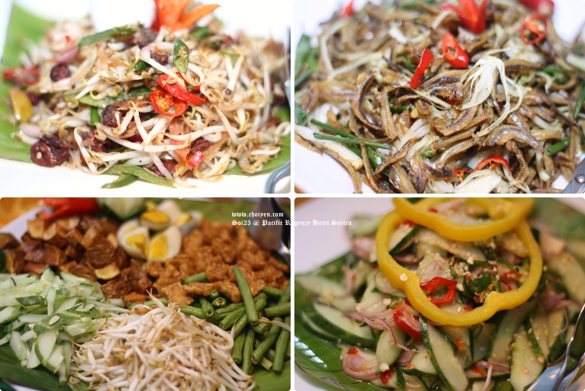 Clockwise from left: Kerabu Taugeh Dengan Kerang, Kerabu Ikan Bilis, Kerabu Timun dengan Cili Hijau and Gado-Gado dengan Kuah Kacang.
