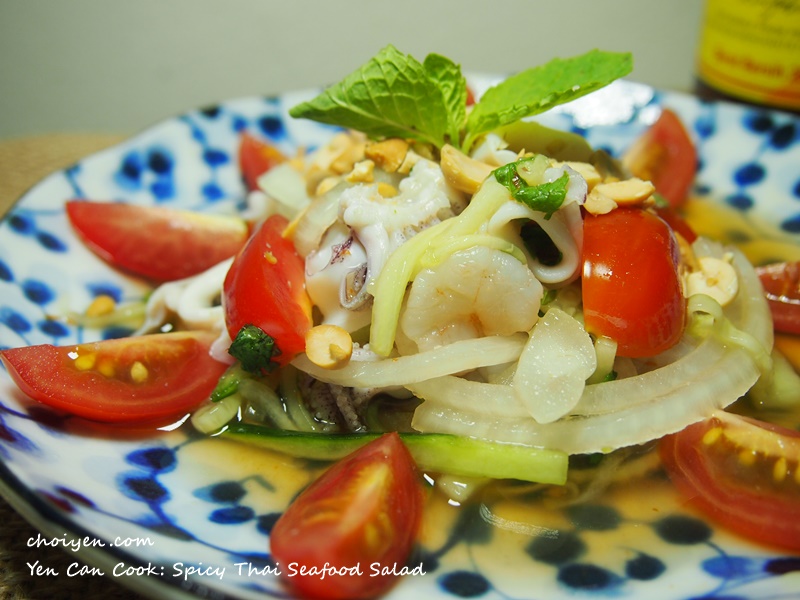 Step 3: Place seafood, cucumber, onion, cherry tomatoes and mint in a large bowl. Add in dressing (step 2), toss to coat all the ingredients. Sprinkle with crushed peanuts and serve.