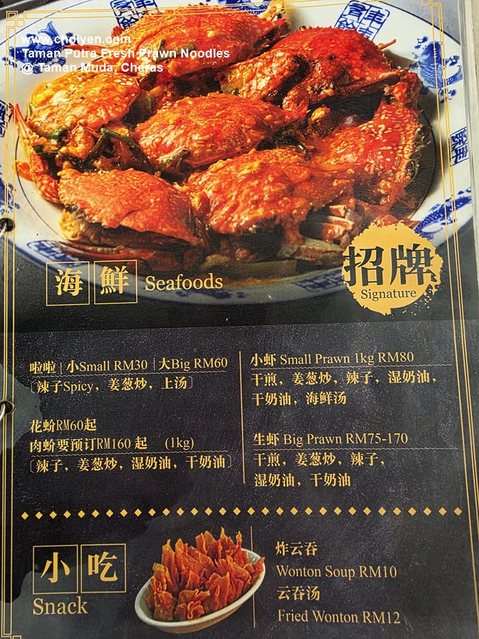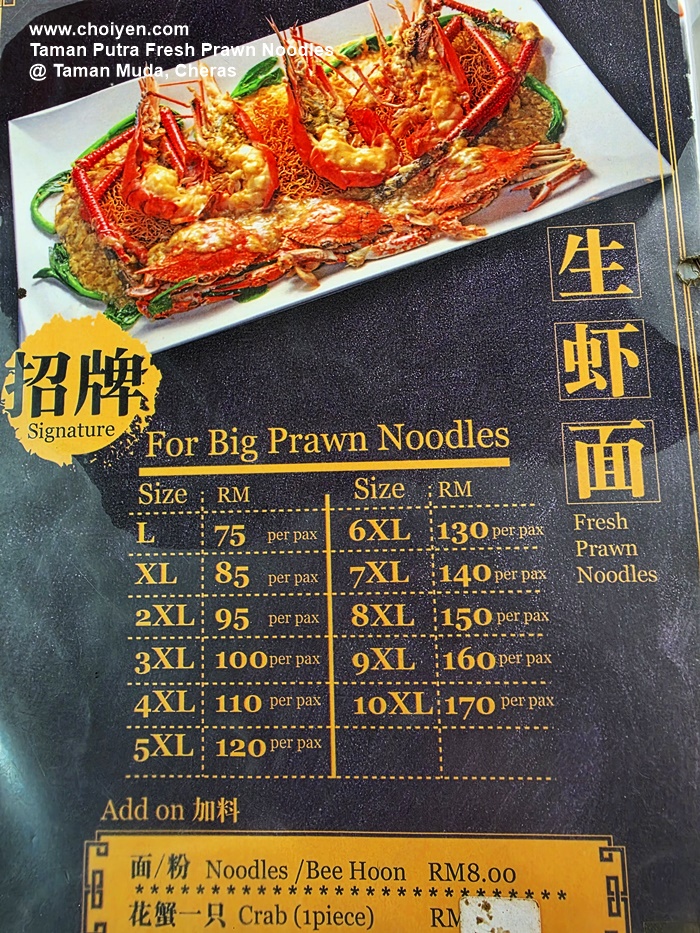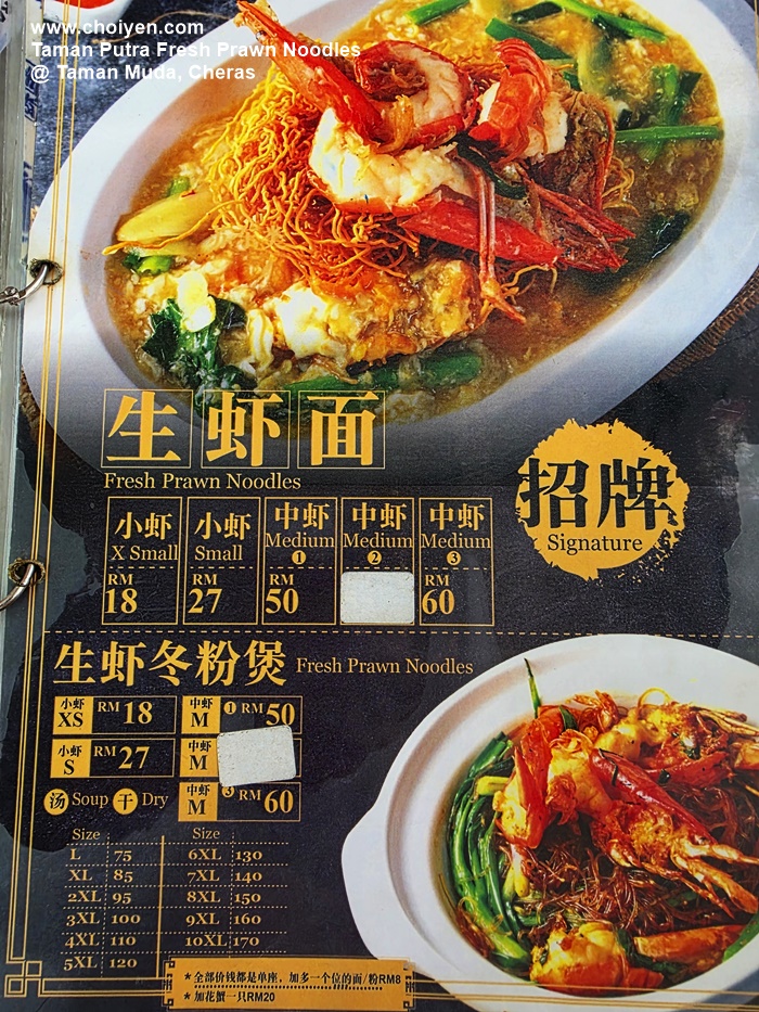 The price of the signature Fresh Prawns Noodles is categorized according to the size of the prawns.