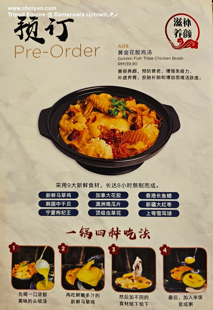 Apart from the variety of soup bases and ingredients for the hotpot, Tripod Empire’s menu also highlighted the above signature dish of Golden Fish Tripe Chicken Broth.