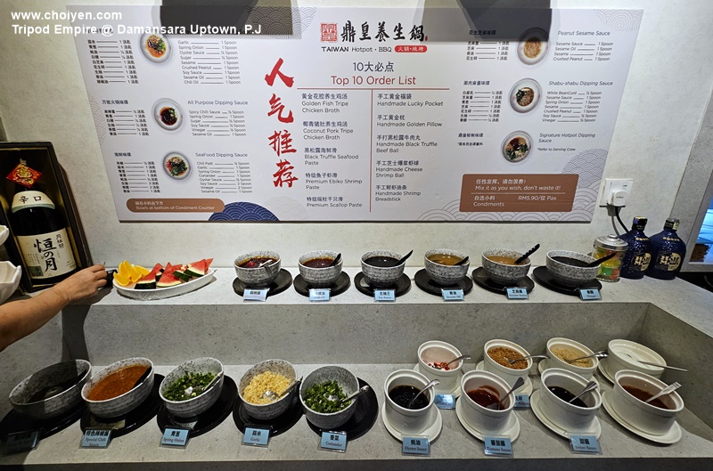 With a Condiments Charge of RM5.90/pax, diners are entitled to enjoy the self-service sauce bar with a great collection of different ingredients and condiments, as well as pickles, fruits and candies.