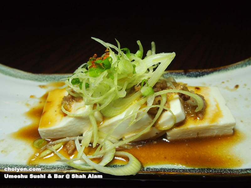 Cold tofu served with savory minced meat miso sauce and the flavors was further enhanced with onions and spring onions.