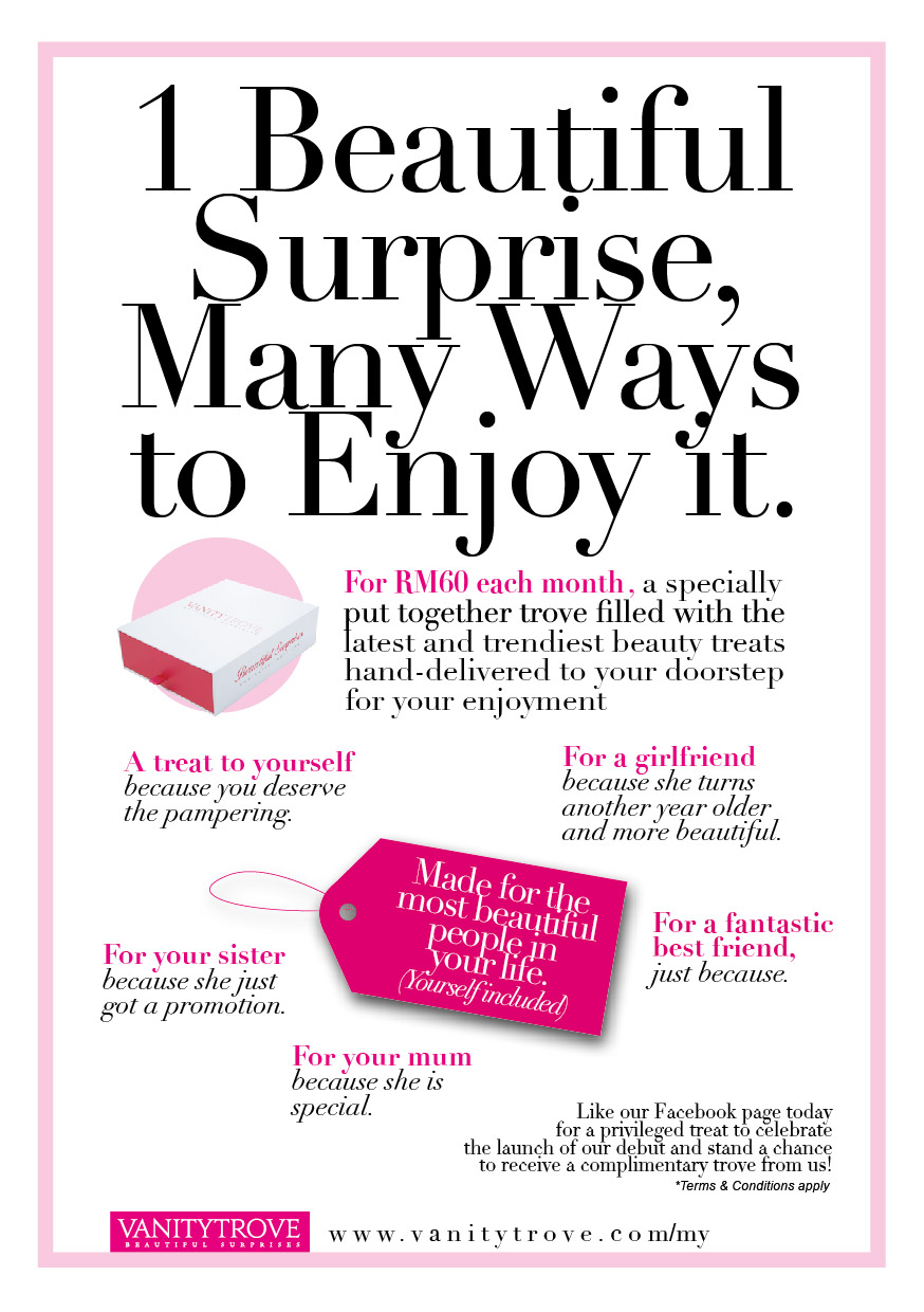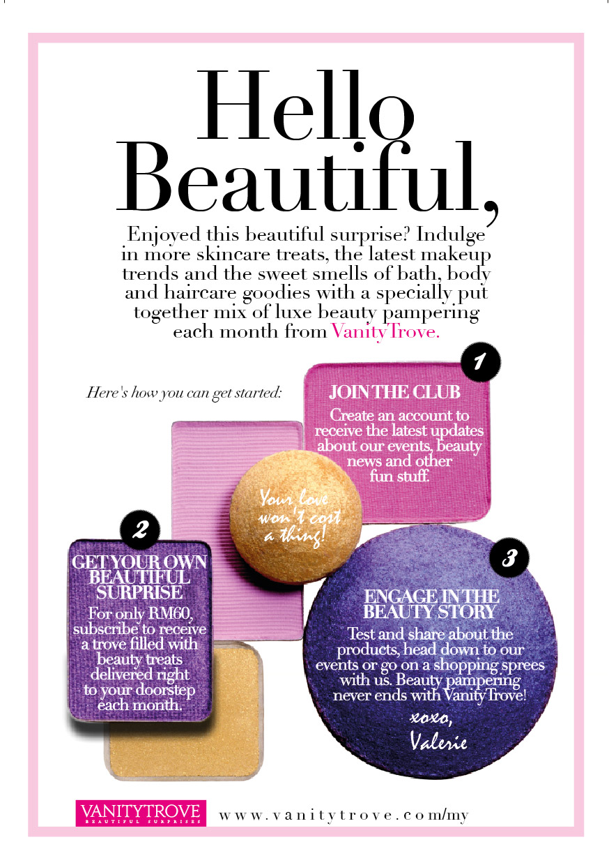 1)     Sign up for an account and subscribe to the service on www.VanityTrove.com/my for the monthly subscription fee of RM60/- (inclusive of packing, shipping & handling fees) or choose the 3, 6, 12 months subscription options to get credits that goes towards redeeming a complimentary trove!