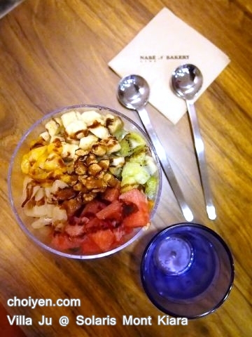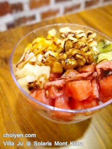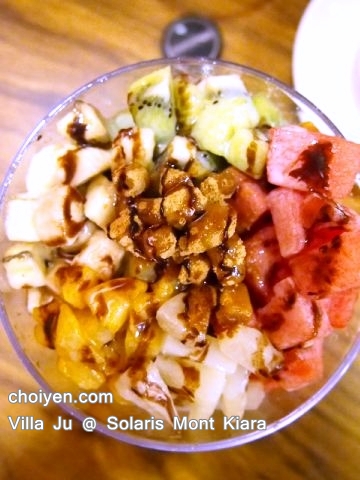 One of the signature at Villa Ju. Pat Bingsu literally means red beans with ice in Korean. It is a shaved ice dessert with sweet toppings such as chopped fruit, condensed milk, fruit syrup, and red bean paste. The snack is highly popular in South Korea.Villa Ju’s version is a colourful bowl of condensed milk infused shaved ice topped with sweeten red beans, assorted diced fruits drizzled with chocolate and caramel syrup then dusted with mung bean powder. I like how the different fruits imparted various of flavors and textures to the overall bite. A very refreshing and “juicy” dessert, me likey  ♥ ♥ ♥