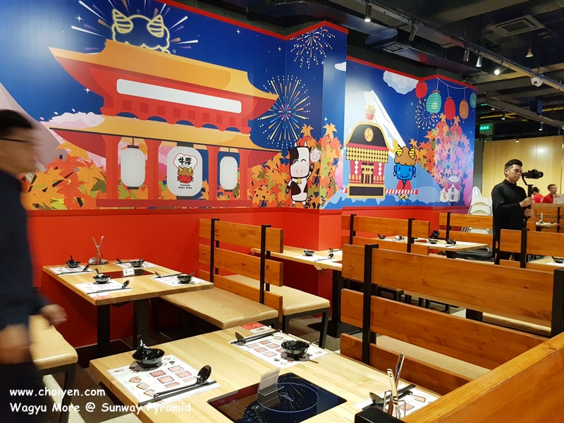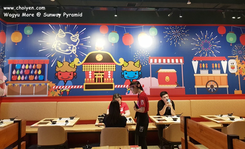 Echoing the design of their first outlet at The Gardens Mall, this latest outlet is filled with vibrancy and lively vibes from the colourful mural of Wagyu More’s mascots – Red More and Blue More as well as other cute characters. The place is spacious and brilliantly sectioned into different dining areas.